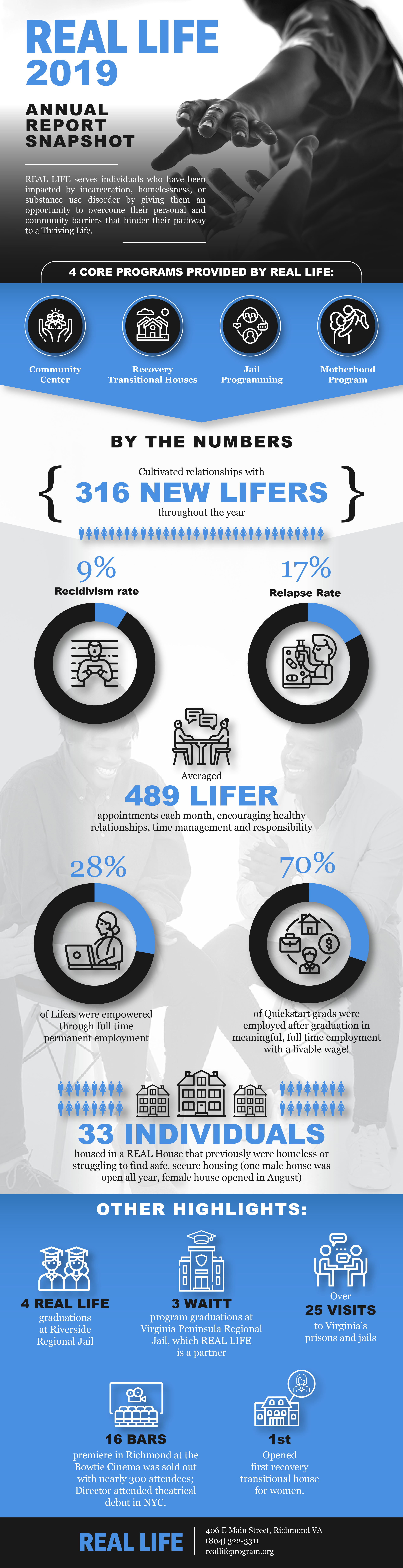 REAL LIFE was founded in 2016 by Dr. Sarah Scarbrough as a response to the growing number of challenges faced by men and women exiting incarceration in Richmond, Virginia. As Program Director in the Richmond City Justice Center (RCJC), or the City Jail, from 2013 to 2017, Dr. Scarbrough and her staff continued to receive multiple calls each week relating to the obstacles faced by returning citizens who were a part of The REAL (Recovery from Everyday Addictive Lifestyles) Program, the nationally and internationally recognized behavior modification program, when they were incarcerated. As a response, we initially began REAL LIFE in the community as a way to continue assisting those exiting the jail program. From there, we grew based upon the need we continued to see by both those from the Richmond jail program, as well as from throughout Virginia. As a result, today, we have 11 recovery houses in Richmond, primarily serving a re-entry population and people from all over Virginia. This is coupled with comprehensive programming, a behavioral modification curriculum written by Dr. Scarbrough, intensive case management, multiple classes throughout the week, and employment and education navigation. On average, people stay with us for about seven and a half months until the complete all requirements to graduate, as well as complete a transition plan.
